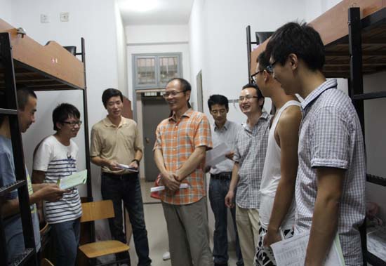 9月11日晚7点,2014级新生报到当晚,在院党委书记王建平教授的率领下,谢志堃副院长、盛宝怀副院长、史正东副书记、新生班班主任和全体辅导员老师等一行逐一走访了银河国际