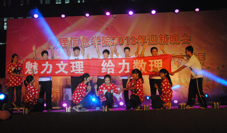 青春,在文理启航;梦想,在这里绽放。“青春数理,璀璨梦想”2013年迎新晚会在第十届全体团学委员的一曲《相亲相爱》中落下了帷幕,迎接我们的是崭新的篇章。