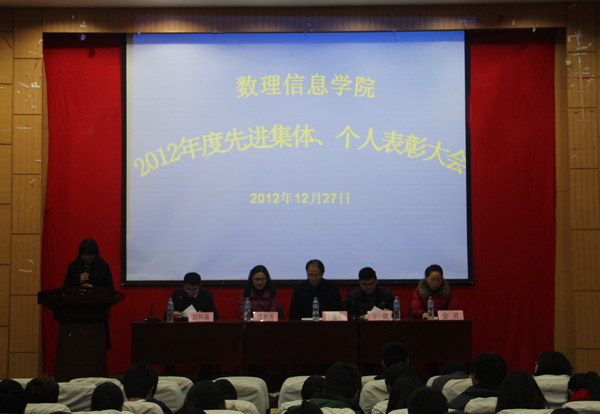 关于表彰2012年度分团委学生会优秀部长、优秀部门的决定》等表彰决定,并通报省级及省级以上学科竞赛获奖名单。与会老师分别为受到表彰的先进集体和先进个人颁奖。院“十佳大学生”、数学建模国家一等奖获奖者、院学生会副主席车佳玮同学在发言中与大家分享了自己在专业学习、学科竞赛活动中的经验和成果,并号召大家为实现目标而不懈努力。
