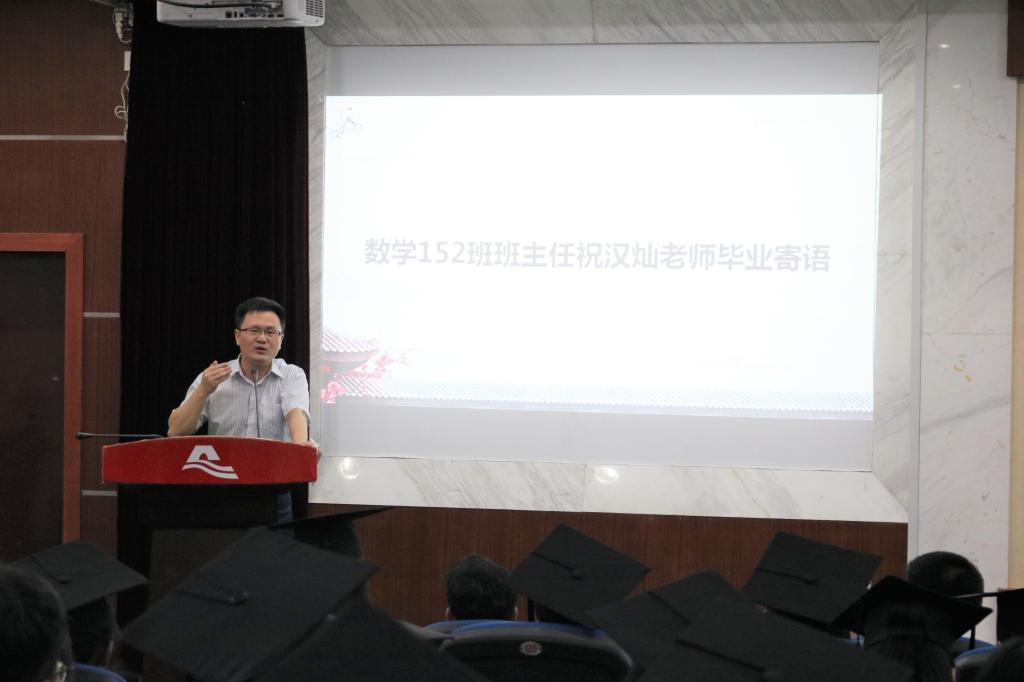 最后一项议程是数学151班班主任王元斌老师、152班班主任祝汉灿老师毕业寄语。这两位老师都感叹岁月匆匆,四年一别而过,毕业生也将迎来全新旅程。老师告诫我们在以后的路途中只有经历磨难才能让自己更强大,所以不要畏惧困难,并提出了几点宝贵意见,第一要积极保持学习,学无止境,只有不断学习,才能提高自己的修养;第二要锻炼身体,保持健康的生活状态才能让自己持之以恒投入到自己的事业中;第三要铭记自己作为人民教师的身份,要立德树人,追求卓越。最后班主任们祝愿同学们前程似锦,成就非凡人生。