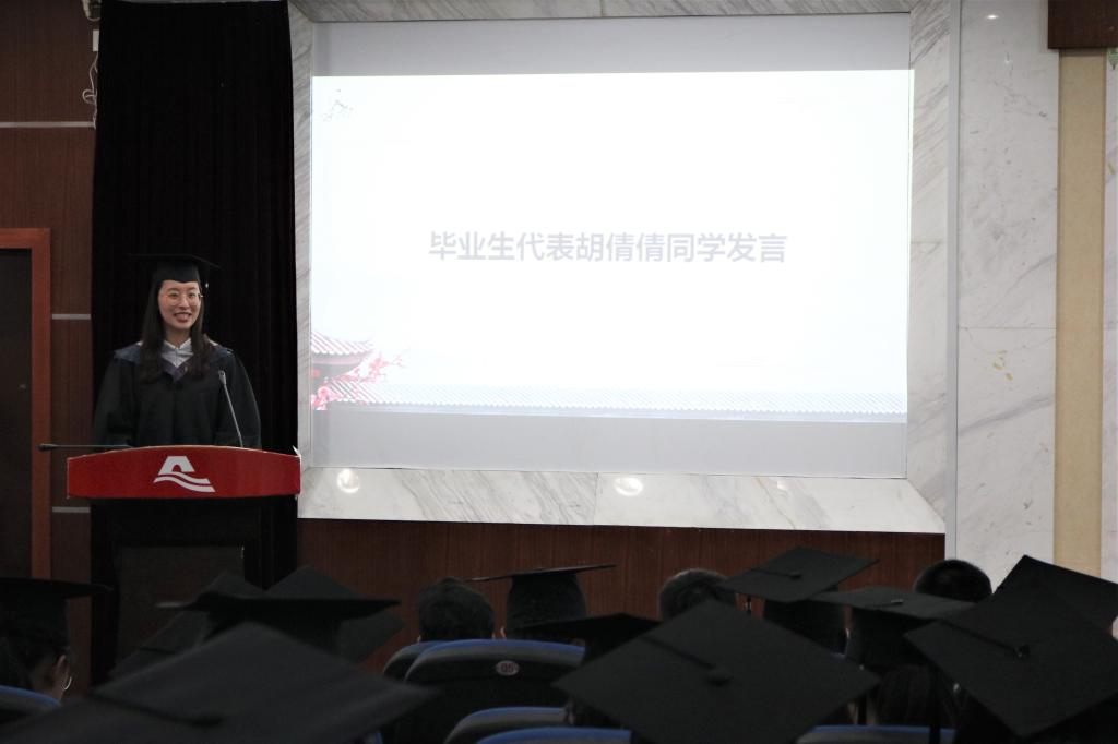 接下来进行第三项议程,来自数学152班的胡倩倩同学作为学生代表上台发言。她首先分享了大学四年来她作为师范生学习和实习时的感想以及对教师这个职业责任和担当的认识。她感悟到教师是值得她坚持一辈子的职业,在今后的工作中她一定努力做到爱岗敬业、关爱学生、为人师表和终身学习。最后她也深情感恩了母校和老师对她的培养和教导,让她的职业生涯规划亮起了一盏明灯,淳淳师恩让她感念不已,让她铭记一生。