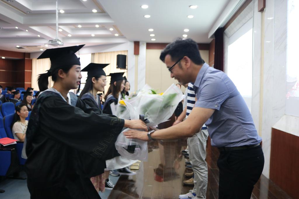 第二项议程是毕业生感念淳淳师恩。方小利老师、王元斌老师、祝汉灿老师、杨哲老师、王晓军老师接受毕业生献花并合影留念。
