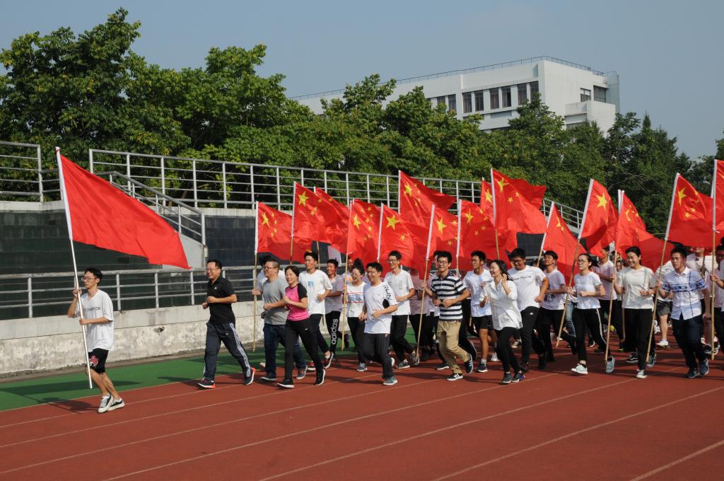 开幕式上,参加合唱的学生进行了快闪活动,献唱了《我和我的祖国》,他们用最熟悉的旋律,表达了对祖国最真挚的祝福。参加跑团的全体学生组成方队摆出“70”的字样,以庆祝新中国成立七十周年。随后,校党委副书记郝敬习老师宣布“迎国庆数理奔跑,看校园最美风景”活动正式开始,跑团活动在红旗的带领下,由老师领跑,浩浩荡荡的奔跑队伍在操场慢跑一圈后跑入校园,边跑步边欣赏初秋校园美丽的风景线。