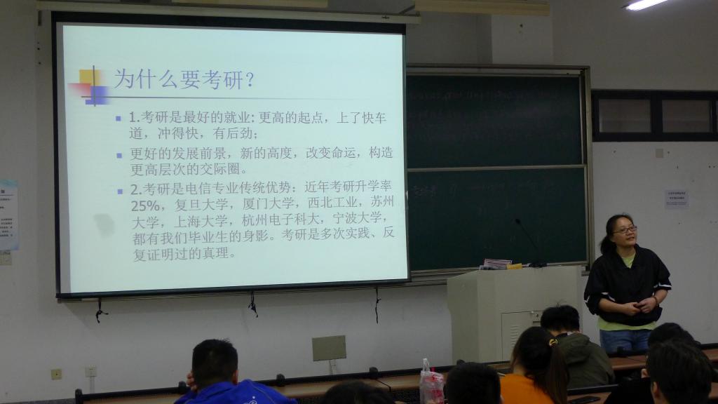 电子信息工程专业在综合楼A306召开动员会议。专业考研导师组组长于梅老师提出了为什么要考研的问题,并且从本专业未来的就业方向,就业情况以及薪资待遇进行了解答。紧接着,于老师分享了自己和已考研学生的对话,指出了考研在当下就业市场对于个人的优势。于老师强调,一定要通过坚持学习,确立目标,改变自己的知识层次,才能够改变自己的命运。