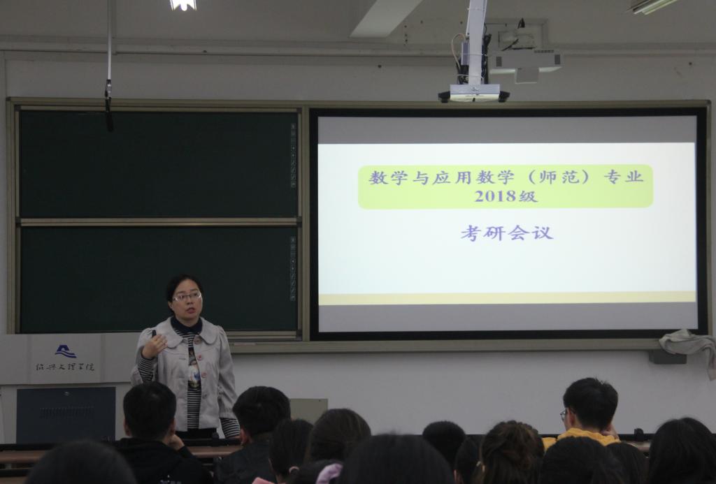 数学与应用数学(师范)专业在综合楼A303召开动员会议。专业考研导师组组长魏雪蕊老师、系主任黄玲娣老师、专业主任周凤燕老师出席了会议。魏雪蕊老师展示了往届数师学生考取的院校,接着具体介绍了可考的专业和考研所需的考试科目,并针对备考过程提出了一些复习建议,并劝告同学们不要扎堆报考,要结合自身的情况去选择院校。系主任黄玲娣老师、专业主任周凤燕老师呼吁同学们都能选择合适的银河国际