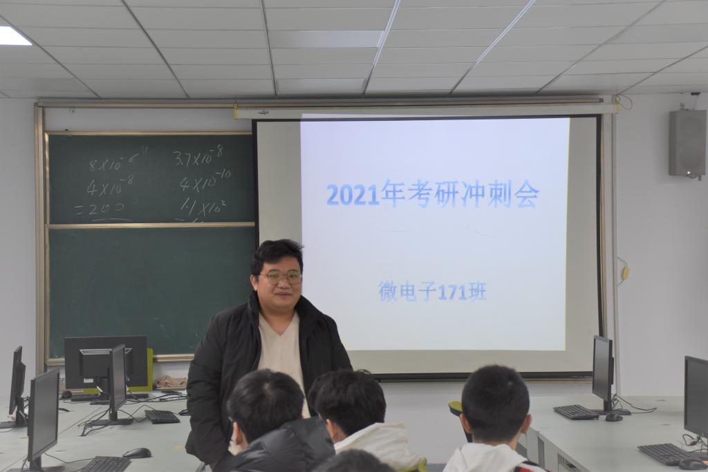 在综合楼A203考研教室召开考研冲刺慰问会。出席本次慰问会的有:电信专业考研导师组组长于梅老师、统计专业考研导师组组长刘焕香老师、微电子专业考研导师组组长徐海涛老师、物理专业考研组导师施碧云老师、全体2017级考研学子。会议由学生科辅导员杜美霞老师主持。