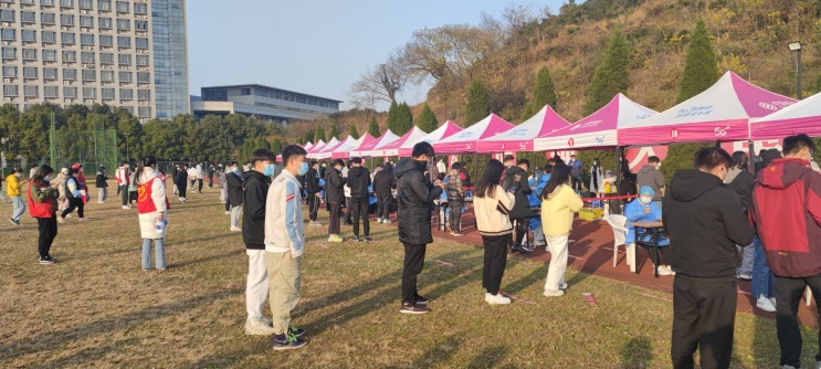 志愿者一起引导分流、维护秩序、做好扫码登记等工作,以便在20分钟之内完成全院在校学生1195人核酸检测工作。