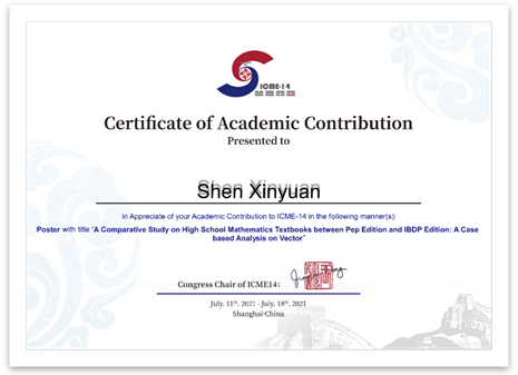 沈心媛同学入学后就跟着导师进行教学技能锻炼和学术研究。在进校后一年半里,她已经以第一作者身份在《数学教学》发表论文《初中生数据分析观念发展状况调查——以绍兴市为例》,在第14届国际数学教育大会中以学术海报的形式发表了《A Comparative Study on High School Mathematics Textbook between PEP Edition and IBDP Edition: A Case-based Analysis on Vector》,并积极参与撰写了两篇SCI论文。