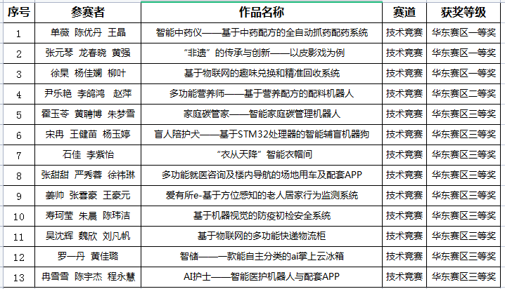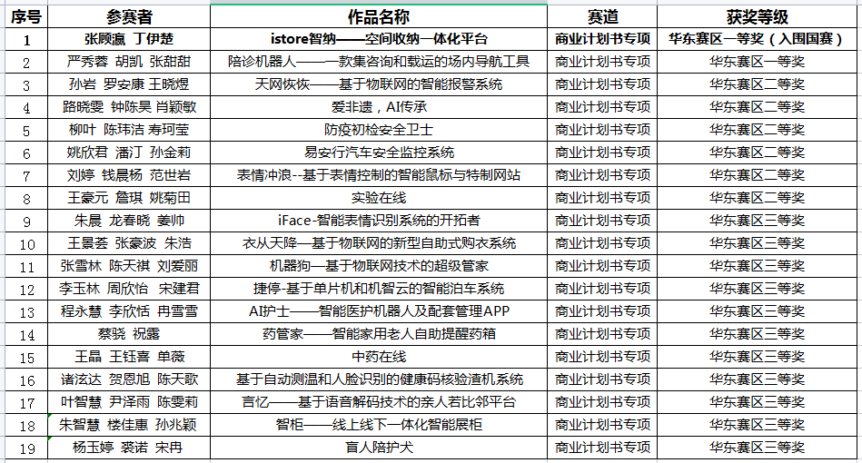 共40只队伍参加了华东赛区(技术竞赛、商业计划书专项赛)的角逐,最终32只队伍获奖,其中华东赛区一等奖5项、二等奖7项、三等奖20项。