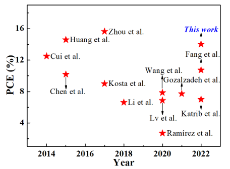 图2.电沉积制备的钙钛矿太阳能电池光电转换效率发展趋势图。