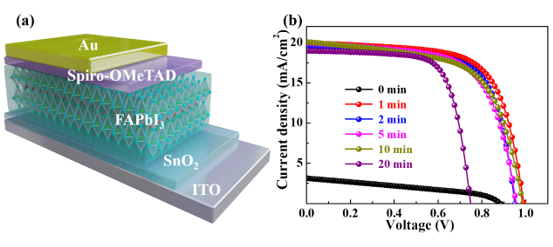 图1.电沉积制备的钙钛矿太阳能电池结构图及其J-V曲线。