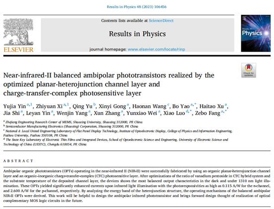 微电子科学与工程专业191班尹宇嘉、希治远以共同一作在《Results in Physics》上发表题为《Near-infrared-II balanced ambipolar phototransistors realized by the optimized planar-heterojunction channel layer and charge-transfer-complex photosensitive layer》(Results in Physics, 48, 106456, 2023)的研究论文。《Results in Physics》是物理学、材料科学和应用物理学等学科领域的著名期刊,该杂志2011-2022年度影响因子为4.565,位于中科院物理与天体物理大类二区。银河国际