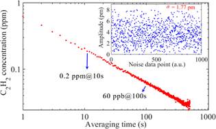通过对比实验进一步研究了该传感器对环境噪声、同频干扰和外部撞击的抑制效果,并对差分悬臂梁增强型光声气体传感器的性能进行了评估,100s积分时间下,对乙炔的检测极限达到了60ppb。该传感器集成了光声信号激发和双通道光纤声波探测,气体感测部分是完全无源的,具有免疫电磁干扰、本质安全、响应速度快、灵敏度高等优势,特别适合应用于煤矿、火力发电站、化工厂、油气传输管道等易燃易爆气体积聚或强电磁干扰工况环境下的痕量气体感测。