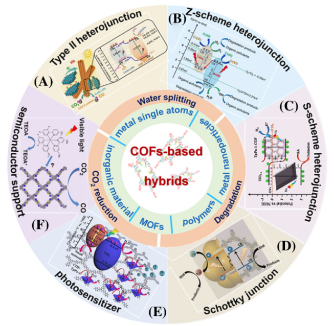 本文综述了近年来COFs基复合材料在光催化水分解、CO2还原和污染物降解等方面的研究进展。首先简要介绍了复合材料(如肖特基结、Z机制异质结、II型异质结和S机制异质结)的光催化机理。随后,我们总结了目前各种COFs基复合物在光催化中的应用进展,并重点介绍了改性对载流子分离和迁移的影响。最后,对COFs基复合材料的发展前景进行了展望,旨在为具有优异光催化活性的COFs基复合材料的设计提供新的思路。