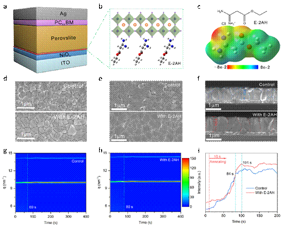 图1. E-2AH修饰埋底界面示意图,以及对钙钛矿薄膜形貌和结晶过程的影响。