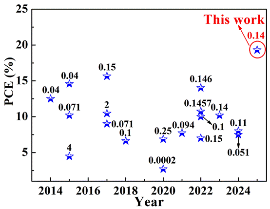 图2.电沉积制备钙钛矿太阳能电池的光电转换效率发展趋势图(图中数字为对应的器件面积)。