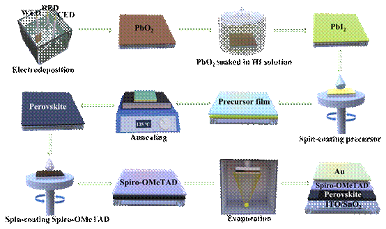 图1.电沉积制备钙钛矿太阳能电池技术路线示意图。
