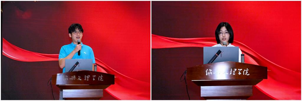本科新生代表朱峻毅同学发言:本科阶段稳扎稳打,努力学习专业知识,积极参加学科竞赛、学术活动,于求学路上持续奔跑;研究生新生代表孙倩倩同学发言:以谦逊之心求知、以务实之态做事,以积极之姿成长,传承绍兴文理的优良校风。