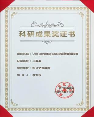 此次获奖不仅是对李安水老师科研工作的肯定,也彰显了张华军教授领衔团队在“cross-intersecting family”极值问题研究领域的实力,以及绍兴文理银河国际