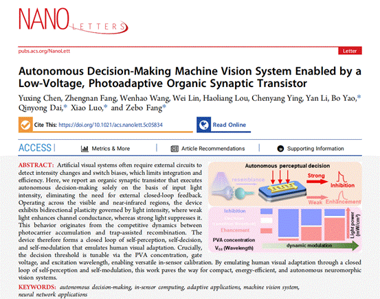 微机电系统浙江省工程研究中心神经形态器件团队在纳米科学与技术领域国际顶级期刊Nano Letters (自然指数(NI)期刊,中科院一区TOP,IF:9.1)上发表了一项最新突破性成果。团队受生物视觉系统启发,成功制备了具有自主感知决策能力的有机突触晶体管。该器件通过感知光强变化,自主响应增强/抑制信号转变并通过调节波长、栅介质浓度等参数实现了器件决策阈值的实施调控。银河国际