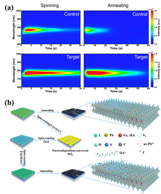 研究团队另辟蹊径,在电沉积转化的PbI2薄膜上引入辛基碘化铵(OAI)界面修饰层,从而将器件光电转换效率从18.38%提升至21.21%,OAI修饰后的器件在氮气中储存1032小时后仍保持84%初始效率,而未修饰器件312小时内即衰减至76%。机理研究表明(图1),OAI首先与PbI2表面未配位Pb2⁺形成中间相OA2PbI4,其作为钙钛矿生长结晶模板,增大晶粒并提升薄膜质量;随后残留OAI分子钝化晶界和界面缺陷,抑制非辐射复合,加速电荷提取。该研究不仅重新确立了电沉积技术作为先进、低成本且高重复性制备路径的潜力,更为优化钙钛矿太阳能电池性能及推动其低成本制备指明了新的研究方向。