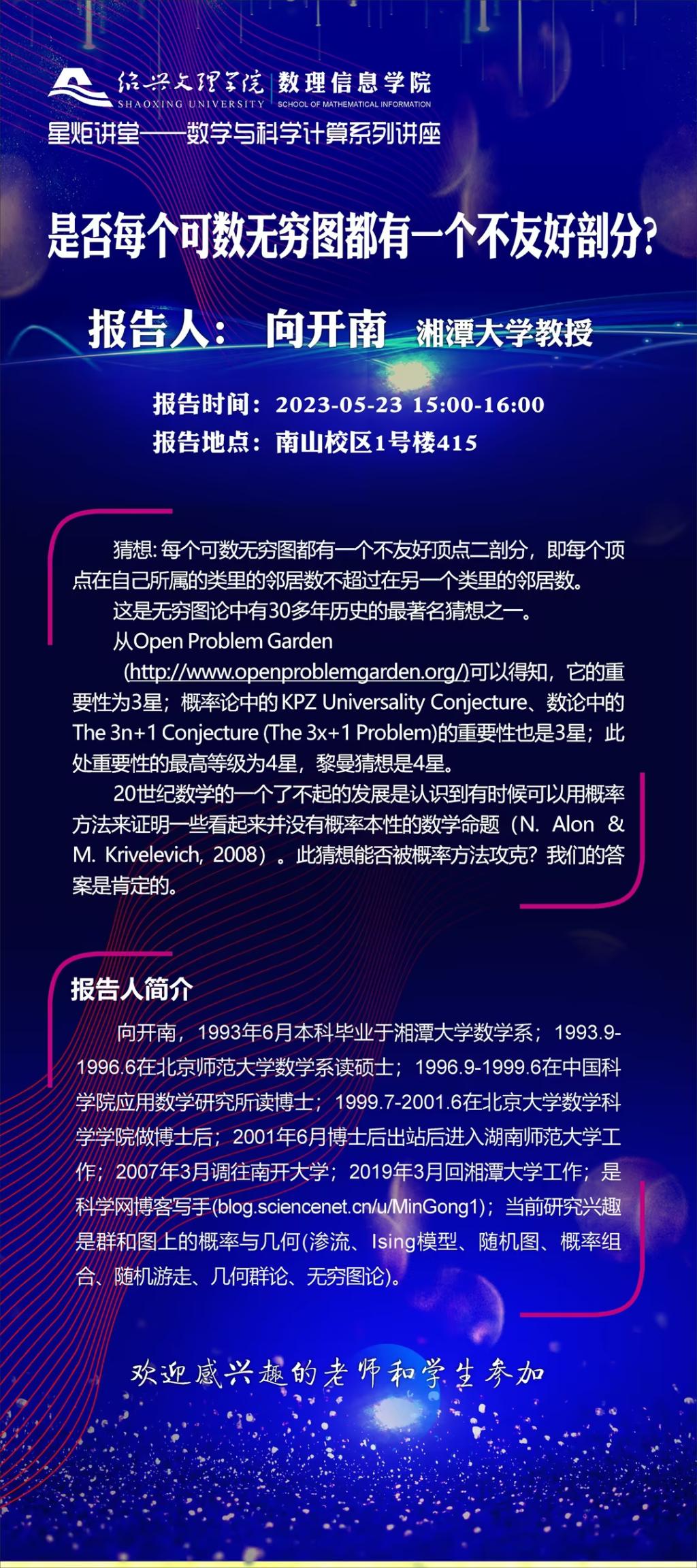 湘潭大学 向开南教授:是否每个可数无穷图都有一个不友好的剖分?