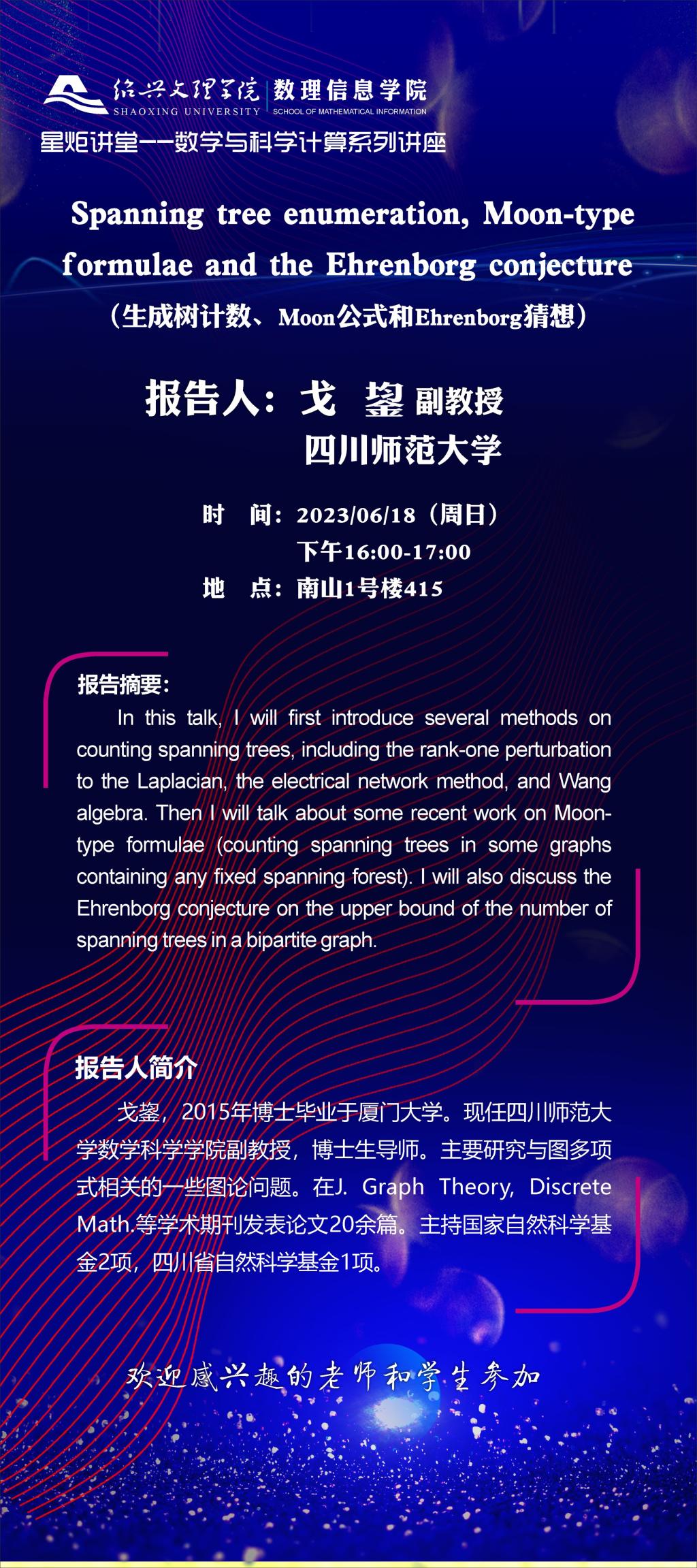 四川师范大学 戈鋆副教授:生成树计数、Moon公式和Ehrenborg猜想