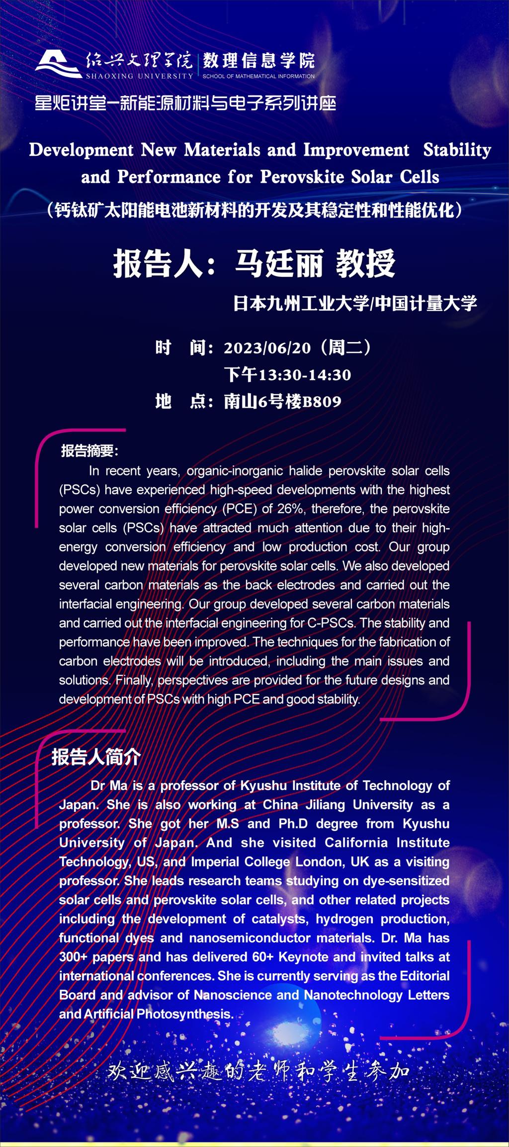 中国计量大学/日本九州工业大学 马廷丽教授:钙钛矿太阳能电池新材料的开发及其稳定性和性能优化