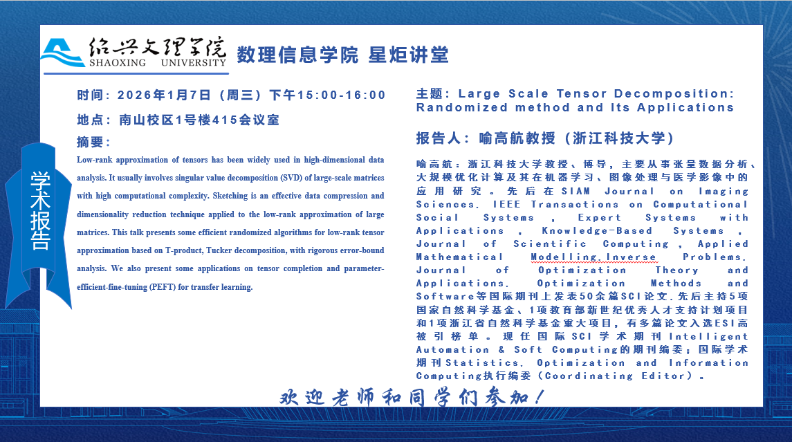 浙江科技大学 喻高航教授:Large Scale Tensor Decomposition: Randomized method and Its Applications