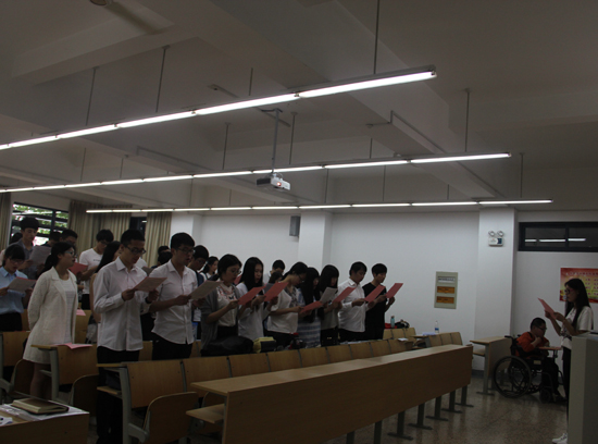 大会在庄严的国际歌声中开始。全体毕业生党员起立,在微电子121班党员伍玲玲同志带领下,重温入党誓词,面向党旗庄严宣誓。面对母校四年培育之恩,全体毕业生党员同时作出郑重承诺:“在离校期间团结带领全体毕业生严格遵守银河国际