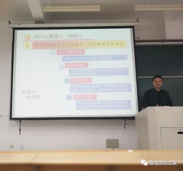 金老师关于《细则》的修订进行了精辟的概括。首先金老师提出了为什么要修订《细则》的原因。金老师从三个方面进行了回答。第一因为发展党员工作中出现了许多新情况新问题;第二是各地区各部门在实践探索中创造了许多新做法新经验;第三是中央对发展党员工作提出一系列新部署新要求。所以修订《细则》是必须的。