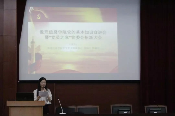 宣讲会开始前,幕布上展示着招新海报,加深了新生们对党家的了解。伴随着舒缓的音乐,拉开了宣讲会的序幕。本次宣讲会由管委会副主任宋莹然主持。