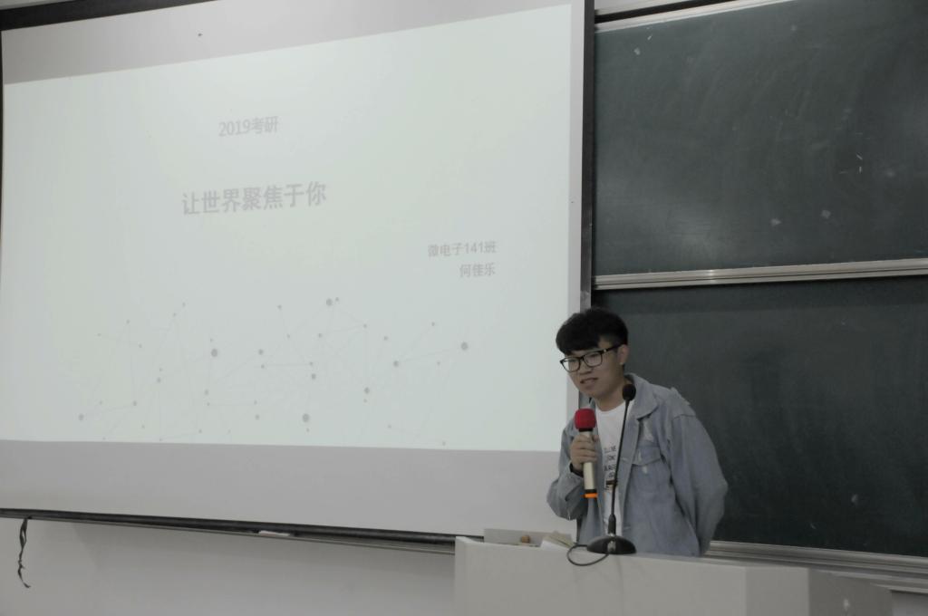 首先上台分享经验的是微电子141 班的何佳乐学长,他今年以优异的成绩考上北京工业大学。学长向大家提出3个重点:定位、信念与心态。所谓定位,就是正确认识自己,确定报考银河国际