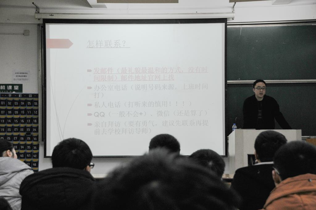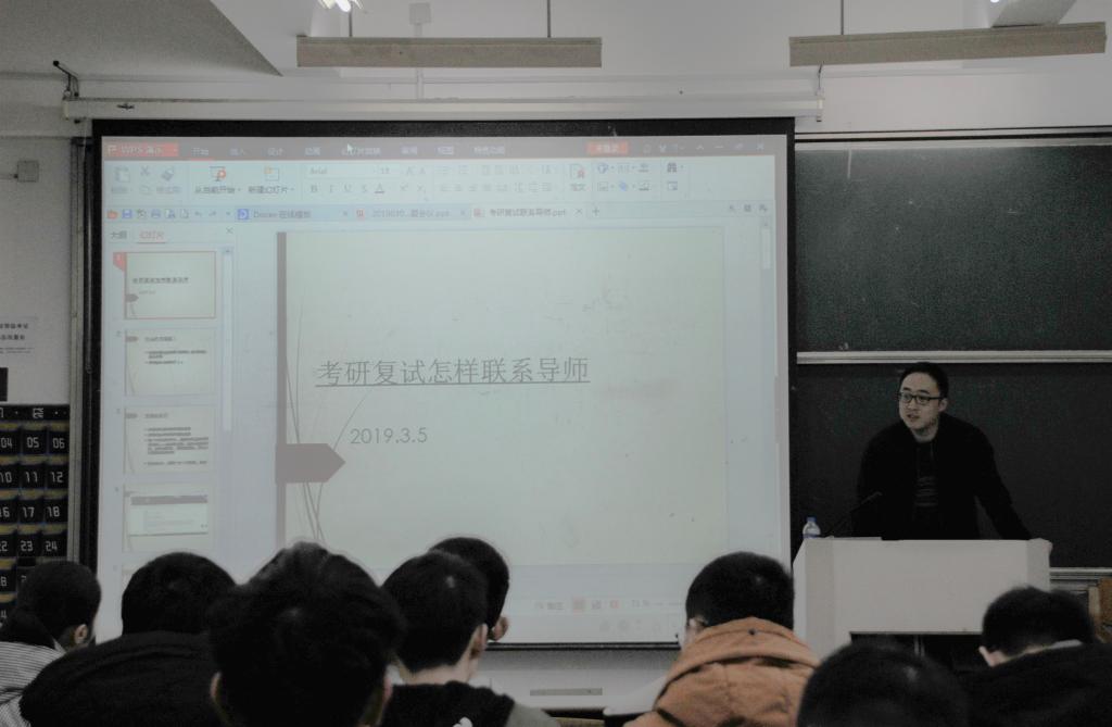 此次讲座的主题是“考研复试与调剂指导”,姚博老师主要侧重于如何联系导师给同学们进行了一次很实用的讲解。姚博老师就联系导师的最佳时间这个方面提出了自己的见解,他表示在初试成绩公布就可以马上着手联系,并且越早越好,先入为主,如果等到国家线公布就可能出现导师手中名额不足的情况。接着,姚博老师针对如何选择导师进行了经验传授:有项目经费、有学术头衔的导师可以成为同学们优先考虑的导师人选。同时,想要看一个老师牛不牛,可以通过观察他近几年有没有国家省部级项目,发表了多少文章,多少项专利,有没有百度百科、GROUP网页等。