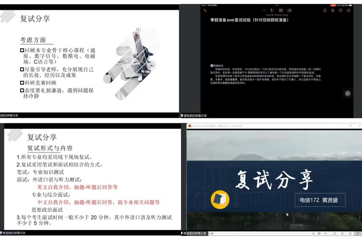 首先会议由原电信172班、现就读于杭州电子科技大学信息与通信工程专业的黄贤盛学长进行分享。在寒假备考方面,学长分享了自己的复试备考经验,包括有自己没学过的书籍、找关键点学习等,同时提到复试老师主要注重专业知识掌握程度以及学生的态度上。