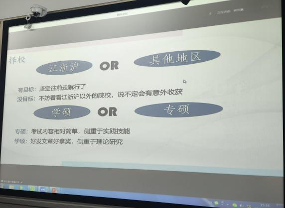 选择开篇,告诉同学们不要过于关注地域,不要将目光投在江浙一带,要将视野拓展到全国范围内。接着于老师推荐了适合的专业课,并告诫同学们一定要树立好准确、适合自己的考研目标,并为之而努力。最后,于梅老师再一次强调了态度的重要性以及为考研所需要的学习和生活的状态,精气神的提高,过一个充实且有意义的大学生活。
