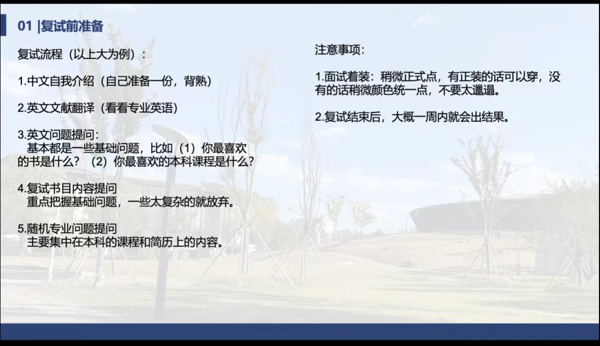首先由徐海涛老师简述考研复试所需要进行的准备,从关注复试信息到准备个人简历、复试复习等,让我们对考研复试的流程有初步的了解。