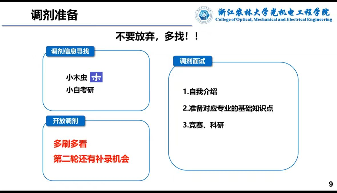 接下来,原微电201班,现就读于浙江农林大学光学工程的王志轩学长详细介绍了关于复试简历的制作和面试环节需要注意的事项,列举了几个象征性的问题供参考,很有借鉴意义。最后讲到调剂准备,鼓励大家遇到调试的情况不要放弃。