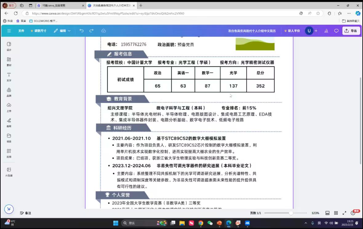 第四位由原微电子(专升本)221班,现就读于中国计量大学光学工程专业的张萧鹏学长展示了自己的简历,提供了一份优秀的模版,从科研经历到个人荣誉都非常完整,激励考研学子更加努力提升自己。
