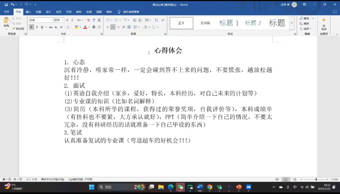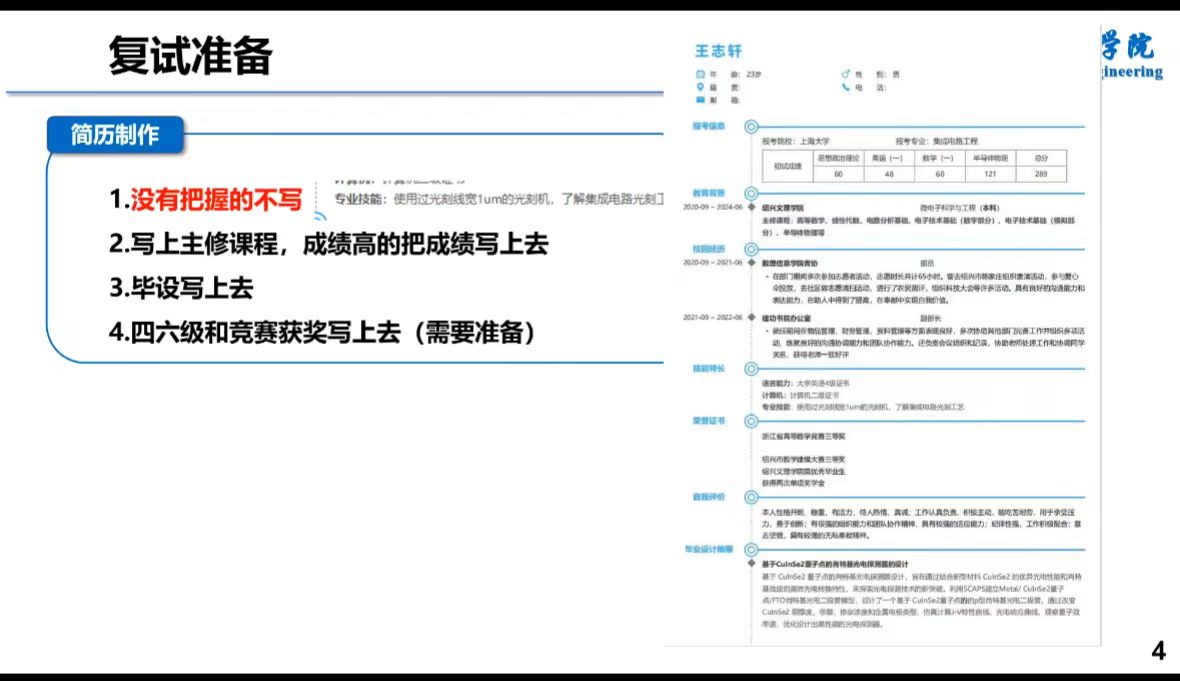 第二位由原微电子(专升本)221班,现就读于上海大学集成电路科学与工程专业的黄俊涵学长分享,他以上海大学的面试为例,列举了复试前后所需要做的准备,详细介绍了面试的流程,指出了一些注意事项,有很好的指示作用。