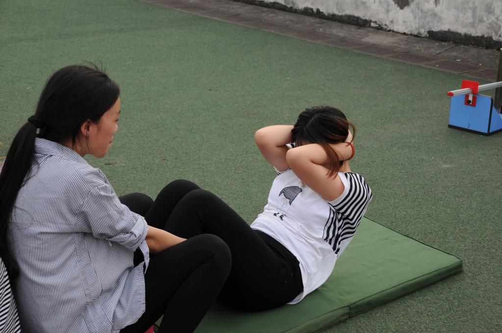 大三各班在体育老师的指导下,积极有序地进行着体质测试训练。