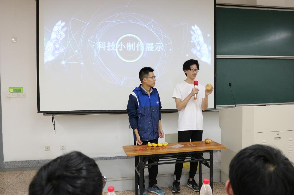 科技部的成员为在场观众展示了两个小实验:“水果电池”和“吸管插土豆”。这两个实验体现了科学无处不在,牢牢吸引了在座同学的目光。接下来科技部为大家播放了一个简短的介绍视频,展示了一些先进的科学技术和创新发明,还有很多生活中的科技应用。这些展示为了说明科技创新其实都源于生活,并且都回归生活。