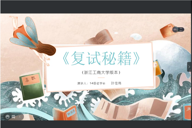 在线上召开了考研复试专题讲座。此次讲座特邀已考取浙江工商大学信息与通信工程专业原电信142班的叶佳伟学长、已考取杭州电子科技大学电子与通信工程专业原电信152班的谷昊周学长、已考取宁波大学电子与通信工程专业原电信152班的易泽鑫学长,为17级考研复试同学带来了一场精彩的考研复试经验分享会。