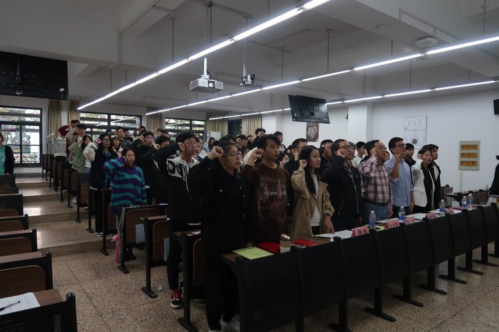 分团委副书记梁兆京一起庄严宣誓。眼睛里波澜的是坚定的光芒,传达的是内心的渴求。“恪守学生本分,牢记本会宗旨,永葆理想主义情怀,扎扎实实做事,营造平等氛围,摒弃庸俗习气”表达的是在座的每一位学生组织成员对学生组织亘古不变的责任心和弥足珍贵的初心。
