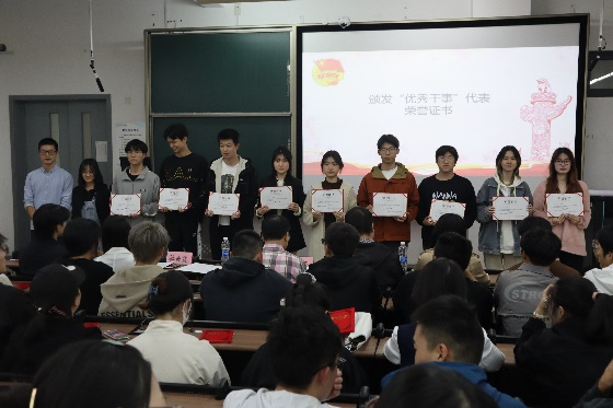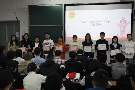 、党员之家两大学生组织的“优秀学生干部”“优秀干事”文件,并由庞飞书记为“优秀学生干部”代表颁发荣誉证书,由杨哲、周依老师为“优秀干事”代表颁发荣誉证书,并合影留恋。