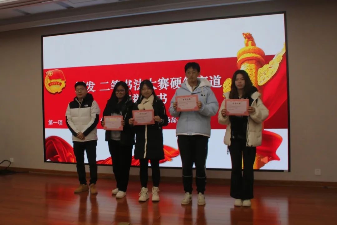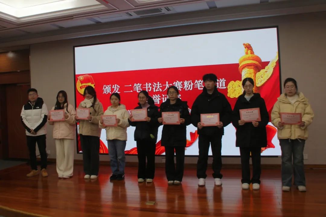 大会第一项议程:宣读“廉洁师魂,墨香传承”二笔书法大赛表彰文件。书法大赛不仅丰富了校园文化生活,更以墨香为载体,让廉洁文化在师生心中生根发芽,为打造风清气正的校园环境,培育德才兼备的学生队伍,起到了积极的推动作用。宣读结束后,陈仔超老师为获奖同学颁发了荣誉证书。