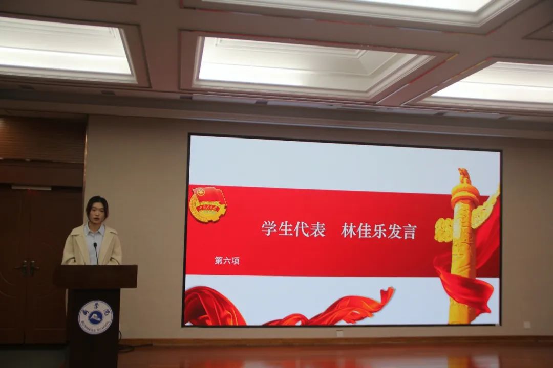 大会第七项议程:由学生代表林佳乐发言,在学生干部能力提升班活动中,过往工作虽有成绩与经验,但也深知自身不足。接下来培训将以饱满热情投入,首先明确自身作为连接银河国际