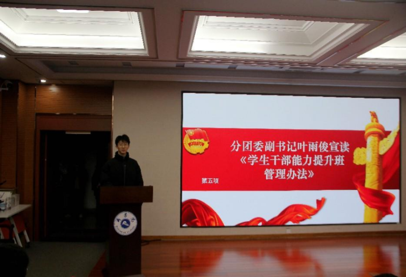 大会第六项议程:宣读《学生干部能力提升管理办法》,旨在全面提升学生干部素养与能力,助力其在校园中更好发挥引领作用,推动校园建设发展。