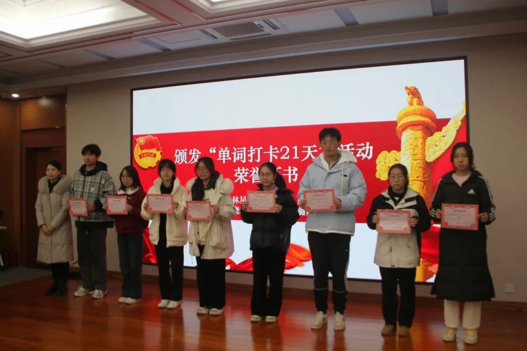 大会第三项议程:宣读“单词打卡 21 天”活动表彰文件。此次打卡活动成功构建起了一个轻松欢快的学习环境,点燃了同学们积极备战四六级的热情。在这 21 天的坚持中,同学们沉浸于单词的海洋,逐步领略英语独特的魅力,不仅丰富了词汇量,更在潜移默化中提升了英语综合素养,为四六级考试通过率的稳步攀升筑牢了根基,有力推动了校园英语学习氛围的日益浓厚与优化。宣读完毕,由杜美霞老师为获奖同学颁奖。