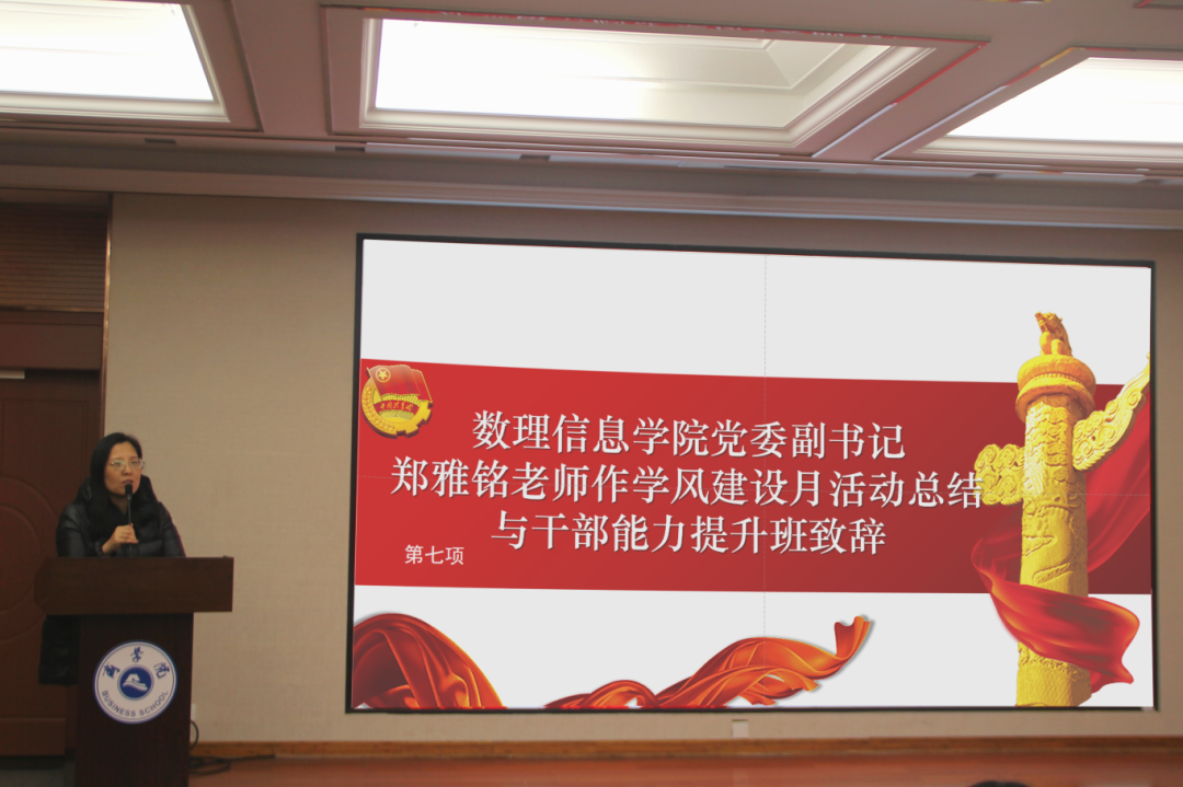 大会第八项议程:由郑书记作学风建设月活动总结与干部能力提升班致辞。郑书记首先强调了学生进入大学应以学业为首要目标。许多同学带着高中未实现的理想踏入大学,却发现现实与想象有差距。从期末考成绩来看,学生不应仅满足于及格,应追求更高的成绩,同时班干部在学风建设中责任重大。最后她强调大学生活应着重培养多元兴趣与交往能力,积极投身实践与科研竞赛,常与师长交流、向学长学姐取经以拓宽视野、充实知识。郑书记对相关活动寄予厚望,期待其持续优化,助力学生全面成长与银河国际